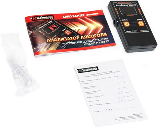 В комплект поставки алкотестера "AlcoHunter Эконом" входит все необходимое для использования