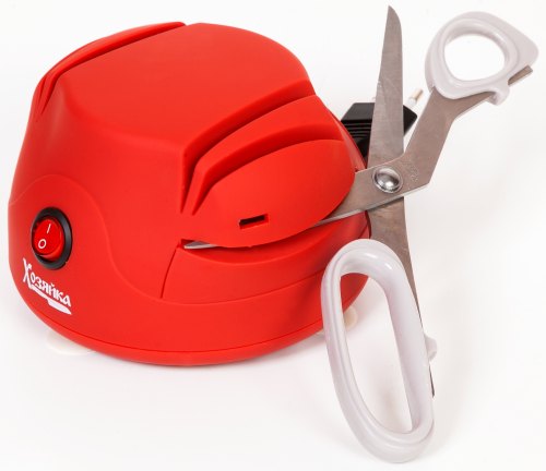 Затачивает ножницы и отвертки. Ножницы обрабатываются в специальном слоте, который находится на боковой части корпуса прибора. Для отверток отведен прямоугольный паз, расположенный чуть выше.