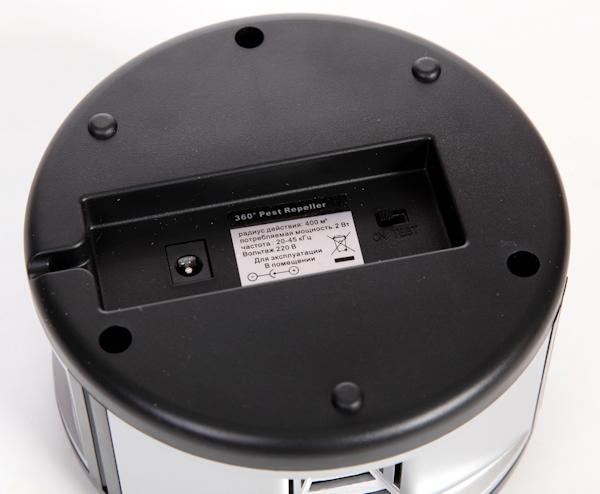Нижняя панель корпуса ультразвукового отпугивателя "SITITEK 360" с разъемом для сетевого адаптера и клавишей тестирования прибора