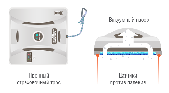 Чтобы начать работу, подключите к роботу мойщику окон адаптер питания и поместите устройство на поверхность. Если вы моете окна с наружной стороны, обязательно закрепите страховочный трос. Даже при отключении электричества робот будет работать от резервного аккумулятора и не упадет в течение 20 минут.